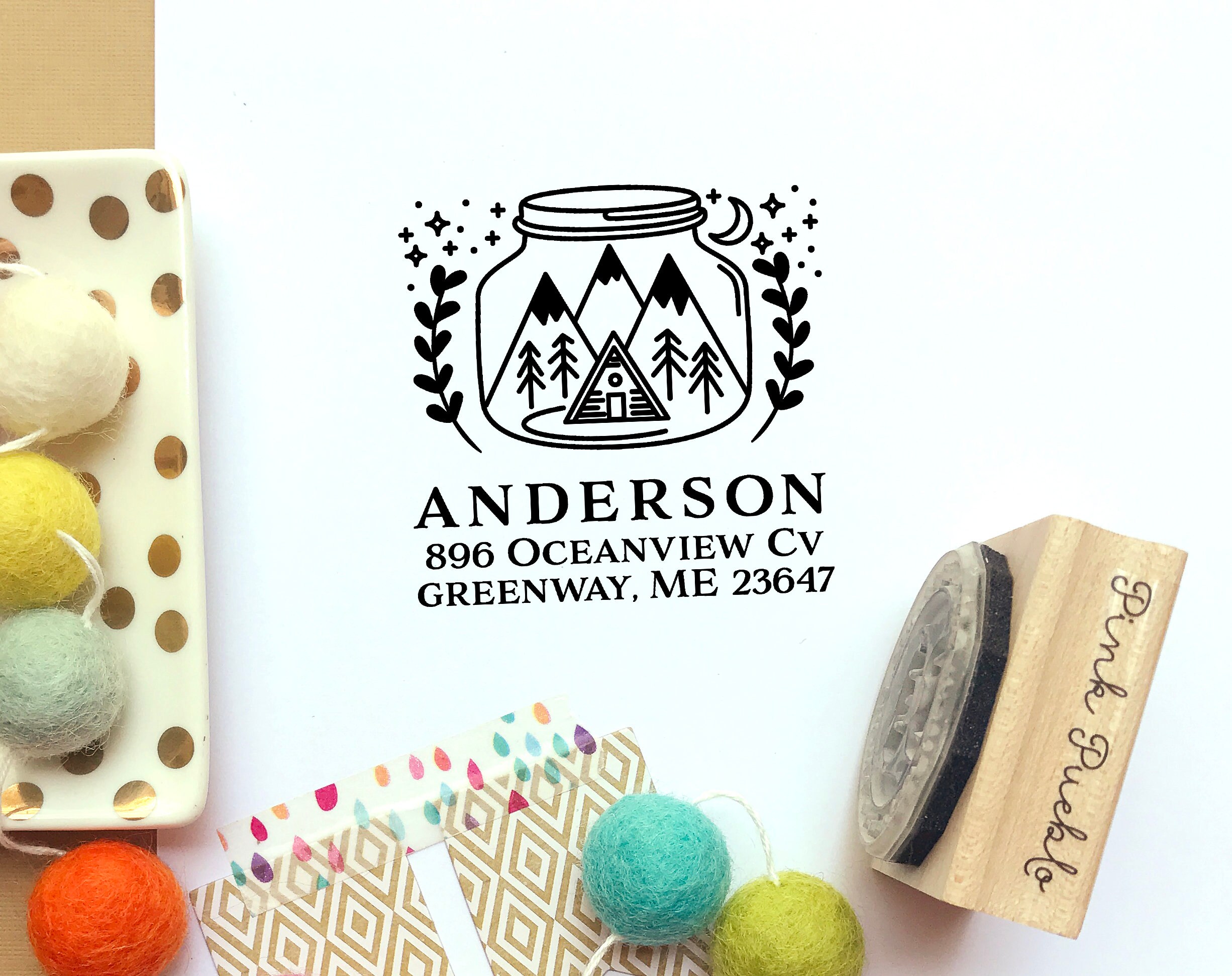 Pink Pueblo's Mountain Address Stamp is a wonderful blend of modern and rustic charm. Featuring a cozy cabin nestled inside a mason jar, this rubber stamp brings a warm, personal touch to your mail. It's a great fit for return address stamps, housewarming gifts, or a thoughtful birthday gift for outdoor lovers. Whether you're sending holiday cards from your cabin, labeling gear for camp, or gifting newlyweds with a custom couples gift, this design adds a touch of nature and personality. It also makes a charming addition to cabin decor or a unique wedding gift that stands out from the usual. The stamp art is original art by Devon (that's me!) at the studio of Pink Pueblo. All stamps are hand made and hand packaged in my studio prior to shipment.