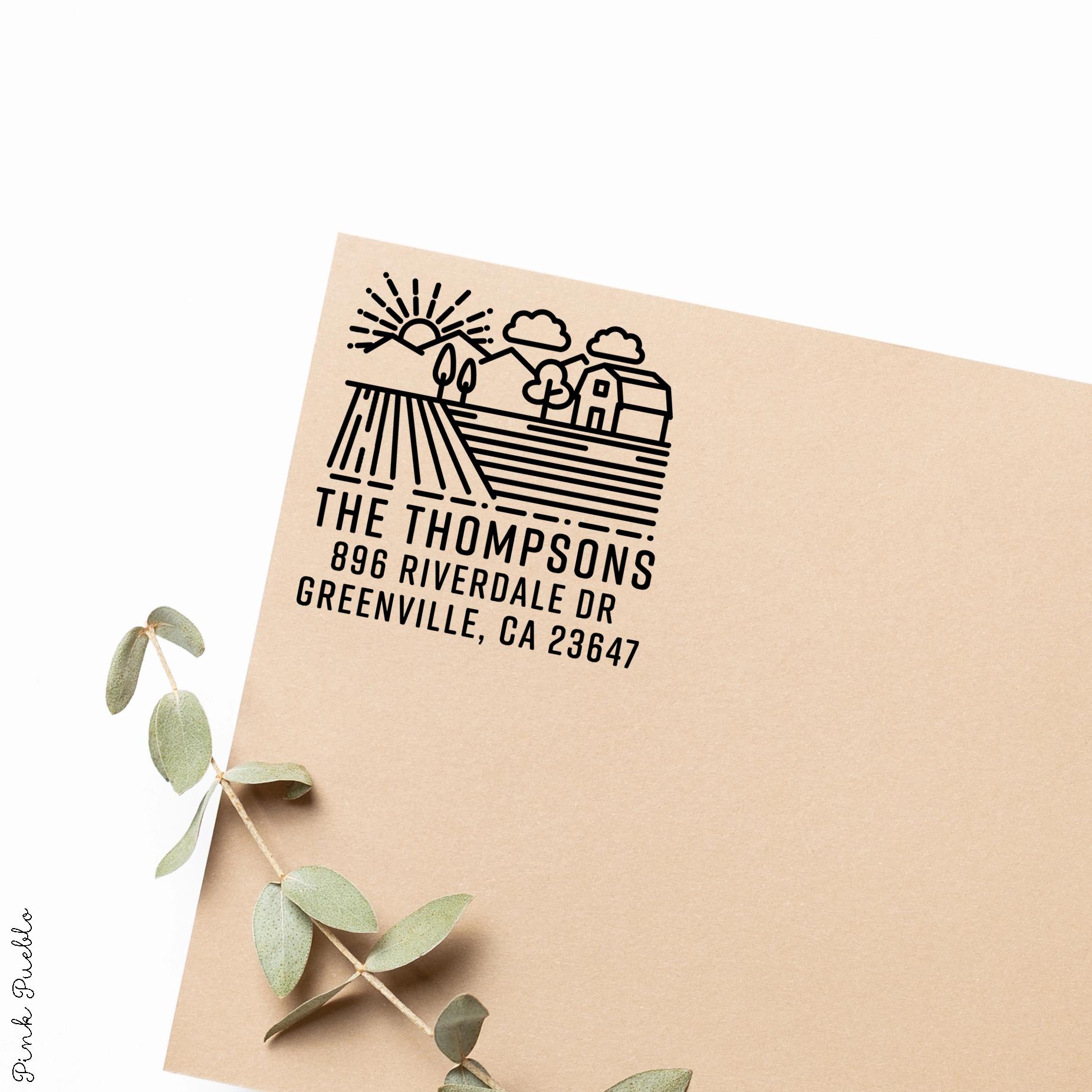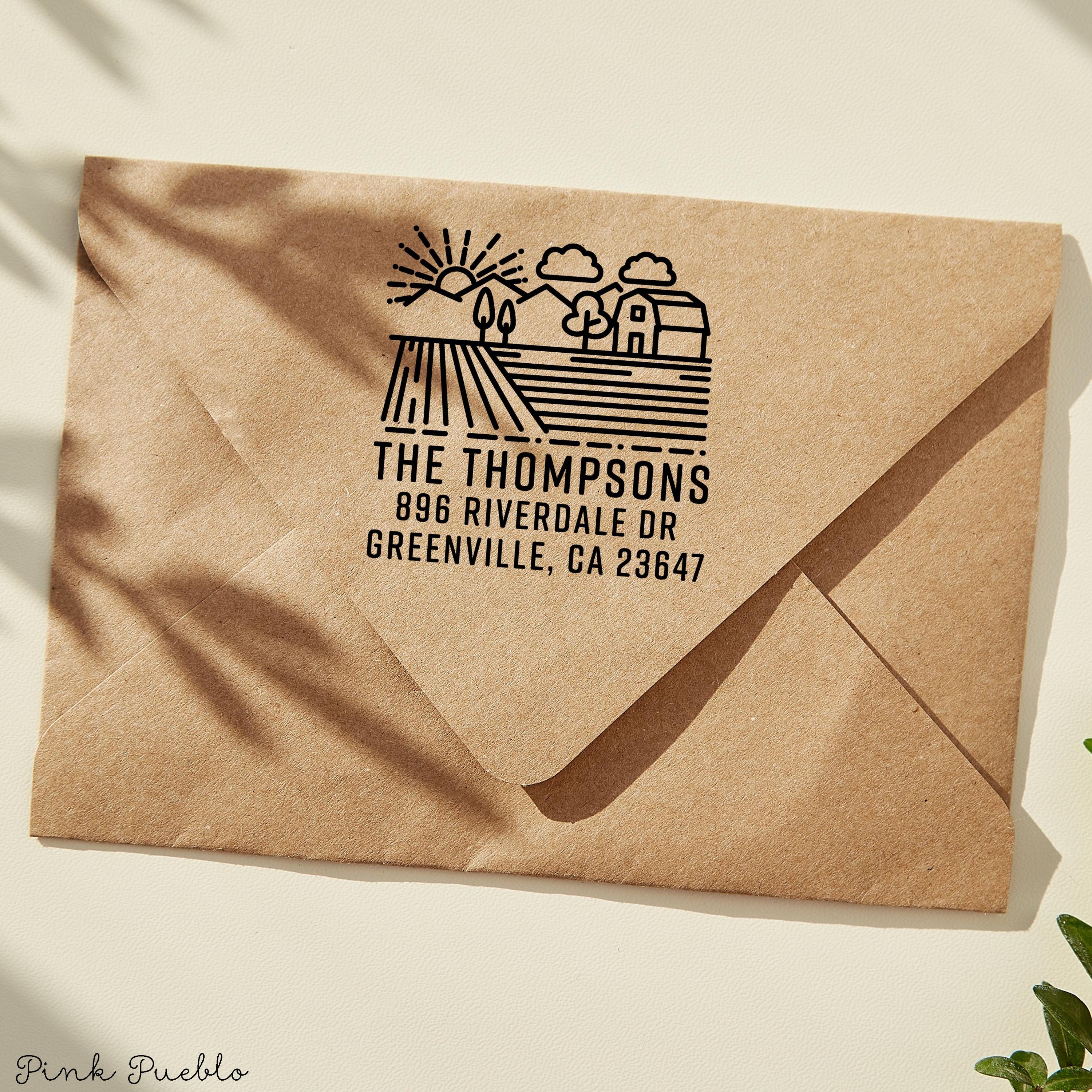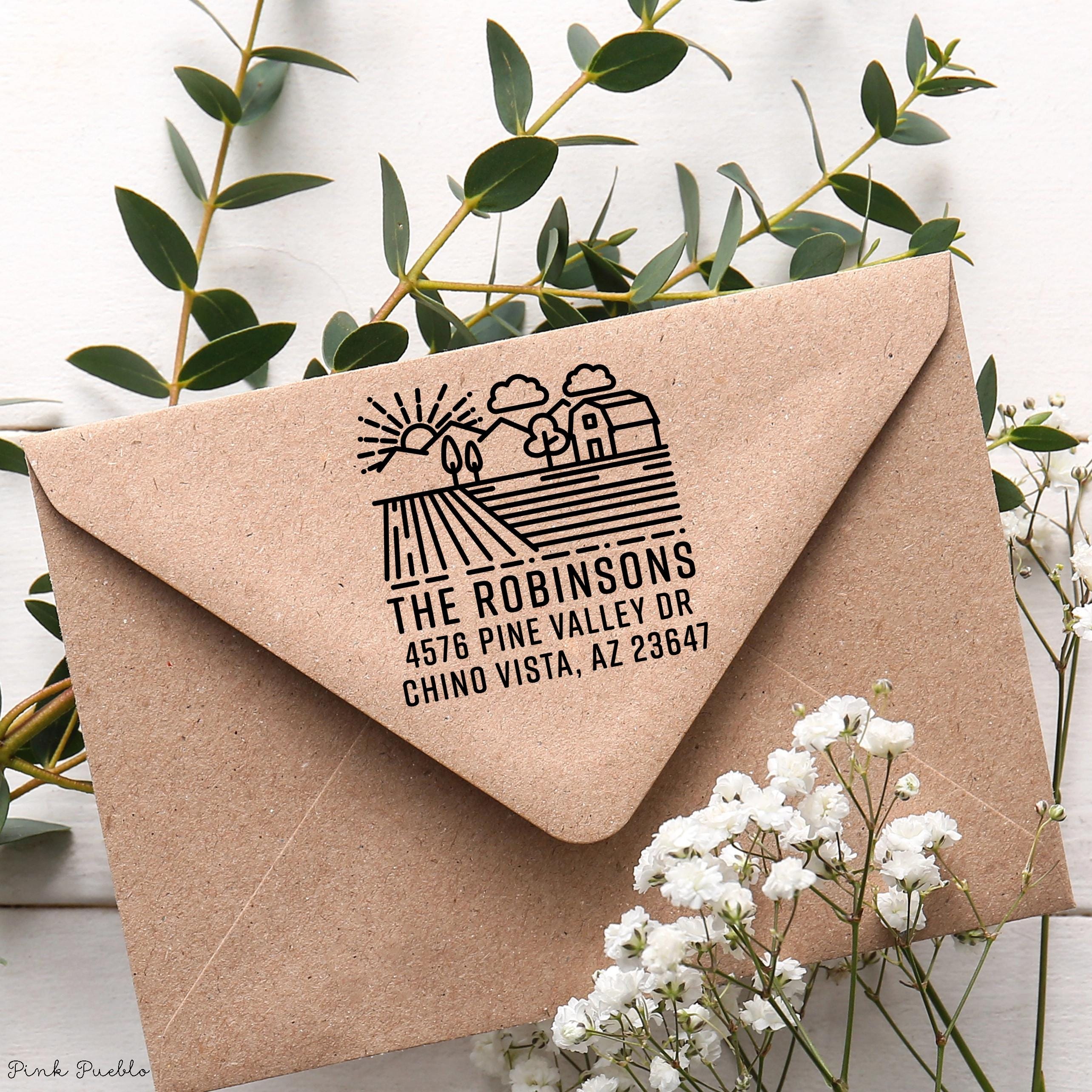 Add a warm, rustic touch to your mail with this farm address stamp, perfect for bringing personality to envelopes and packages. This custom address stamp features a charming barn design that fits beautifully with farmhouse decor, cottagecore decor, and French country style. Whether you're updating your return address stamp or pairing it with address labels, this piece blends everyday function with cozy countryside style, making it a thoughtful housewarming gift, wedding gift, or meaningful couples gift for any home. The stamp art is original art by Devon (that's me!) at the studio of Pink Pueblo. All stamps are hand made and hand packaged in my studio prior to shipment.
