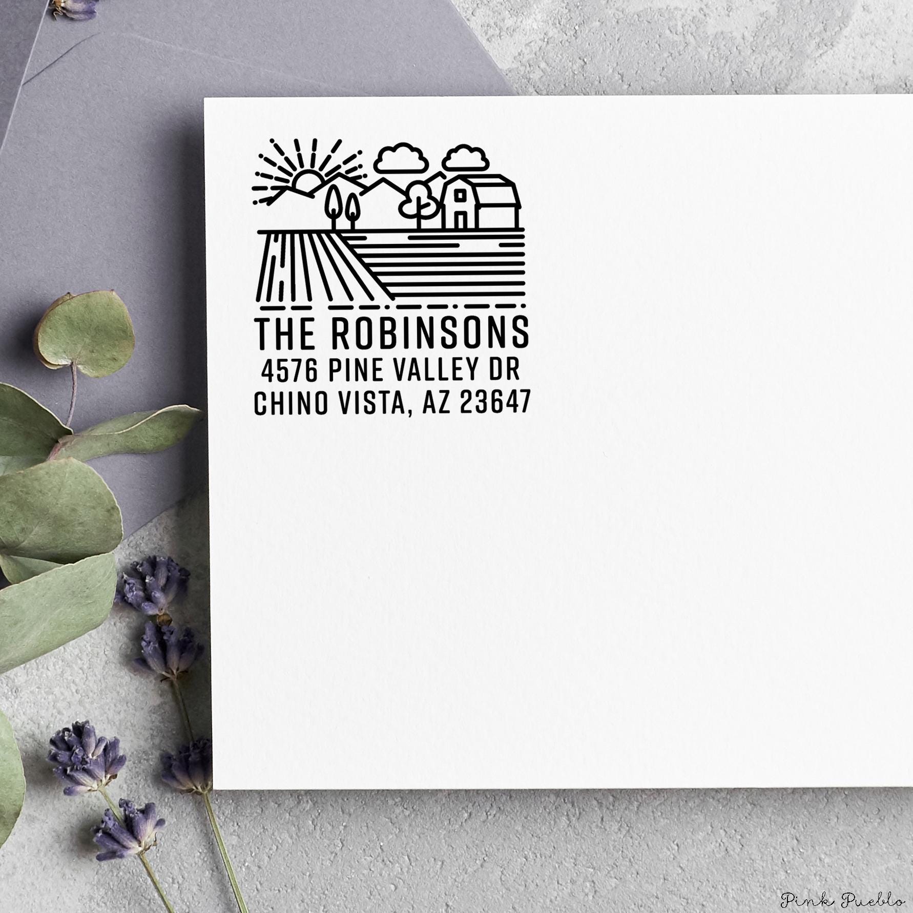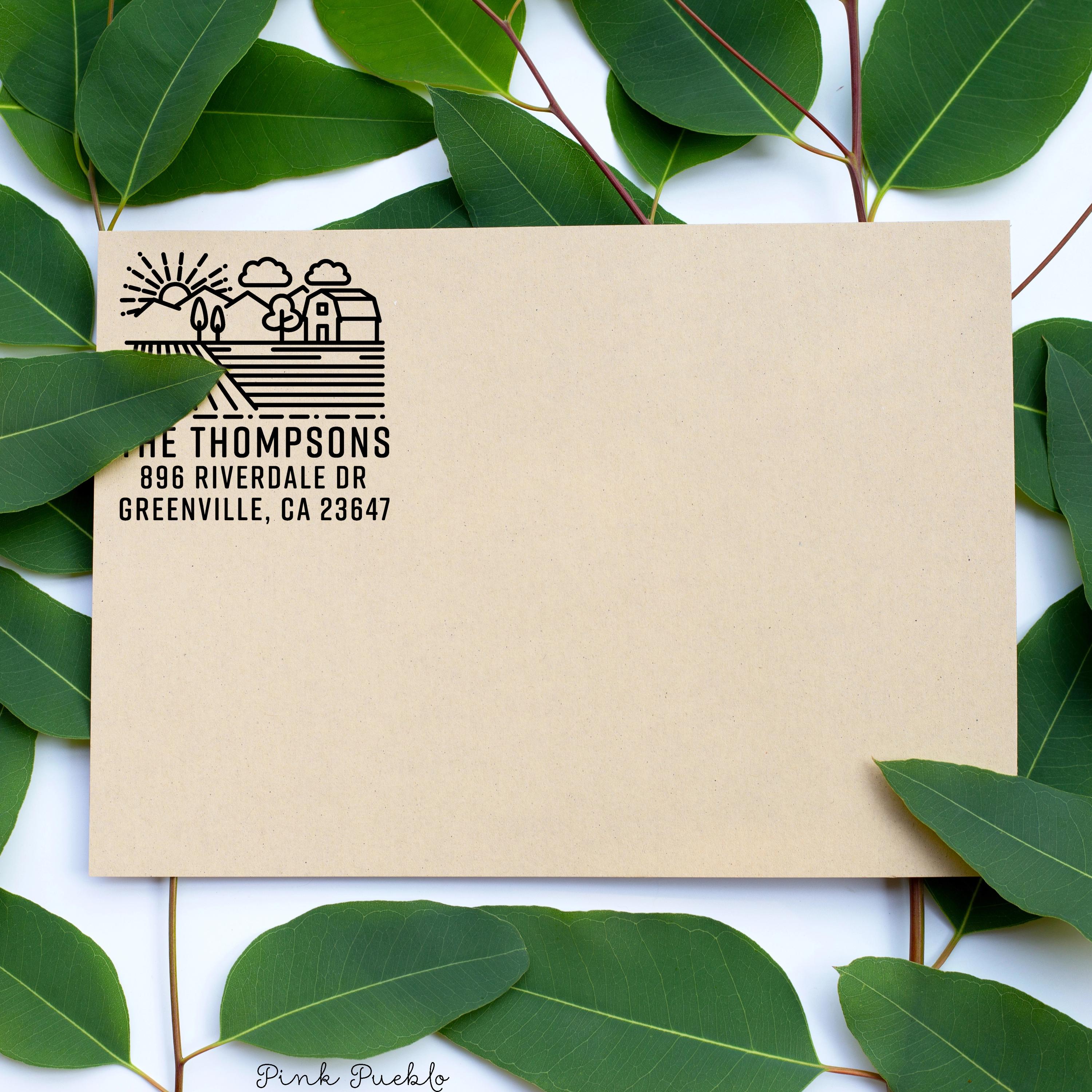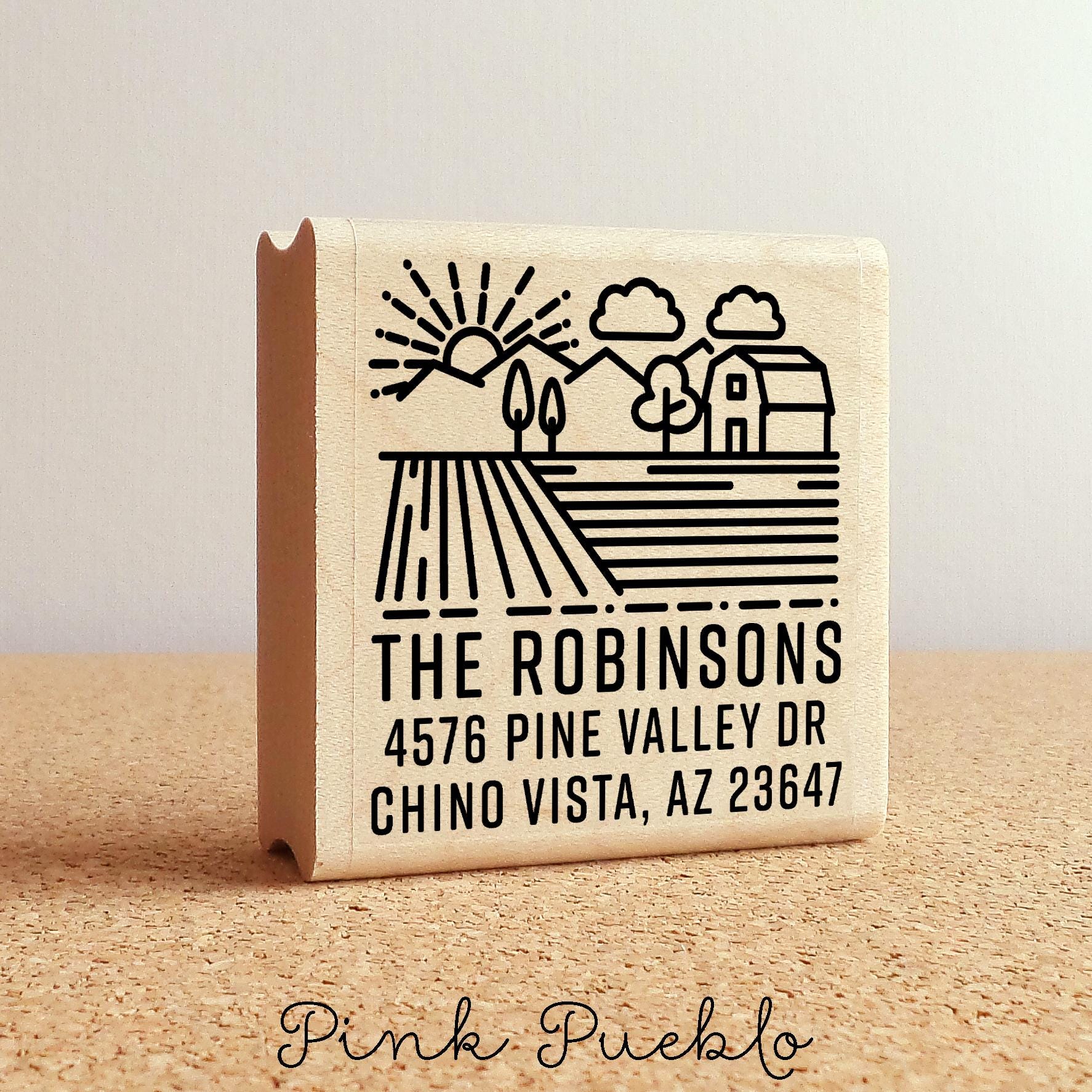 Add a warm, rustic touch to your mail with this farm address stamp, perfect for bringing personality to envelopes and packages. This custom address stamp features a charming barn design that fits beautifully with farmhouse decor, cottagecore decor, and French country style. Whether you're updating your return address stamp or pairing it with address labels, this piece blends everyday function with cozy countryside style, making it a thoughtful housewarming gift, wedding gift, or meaningful couples gift for any home. The stamp art is original art by Devon (that's me!) at the studio of Pink Pueblo. All stamps are hand made and hand packaged in my studio prior to shipment.