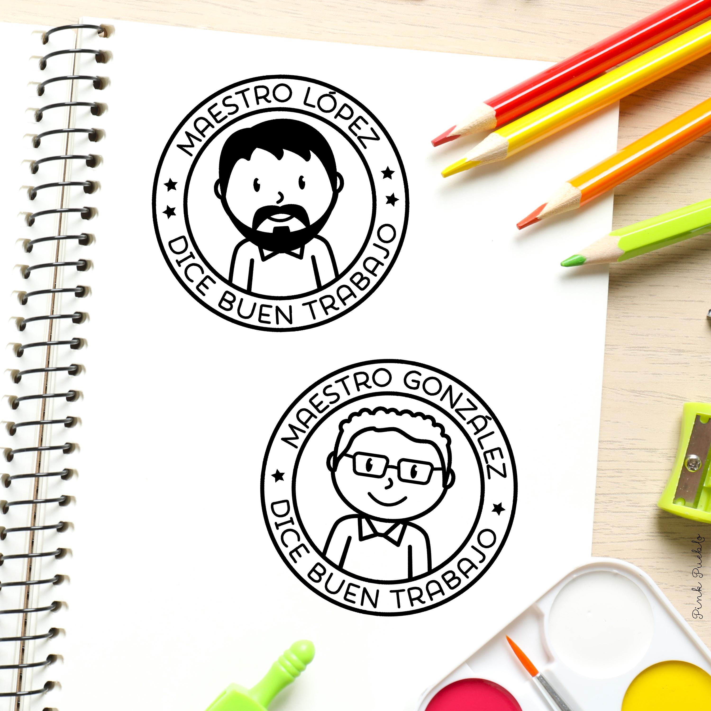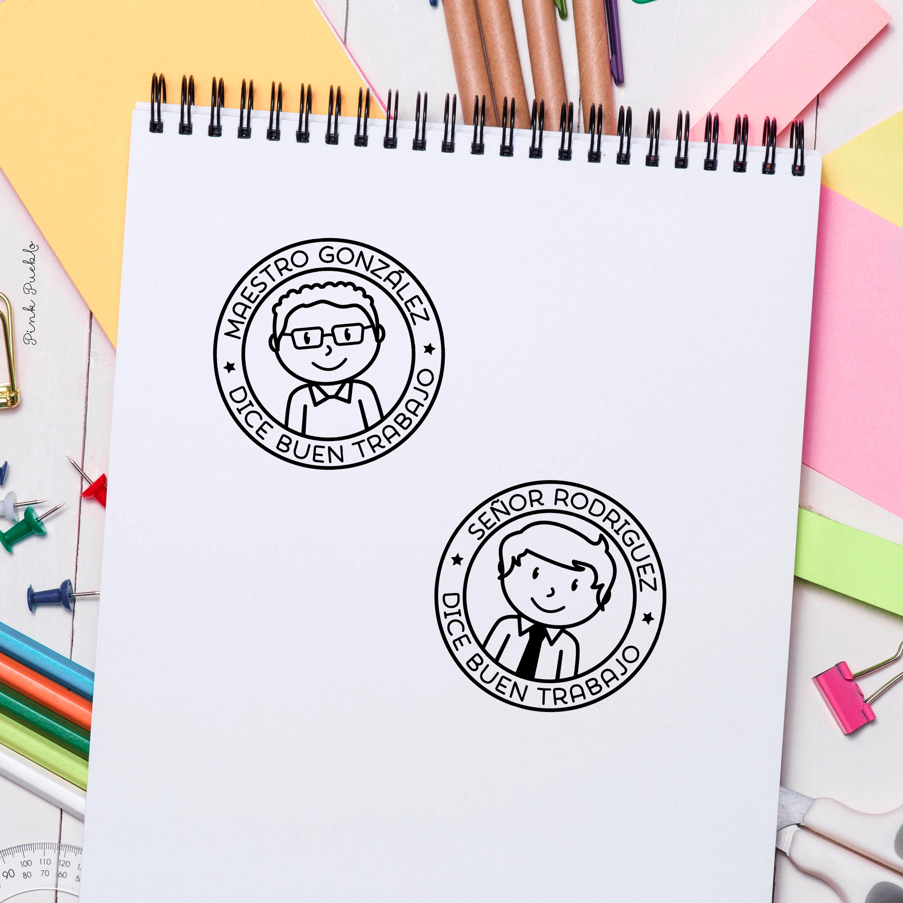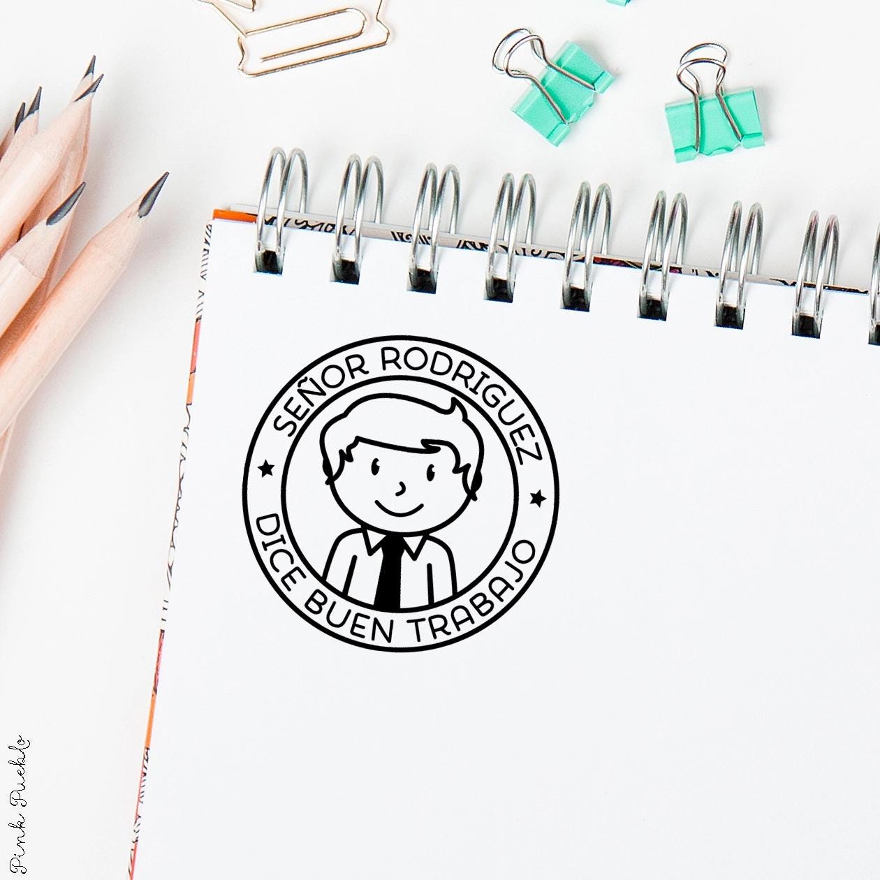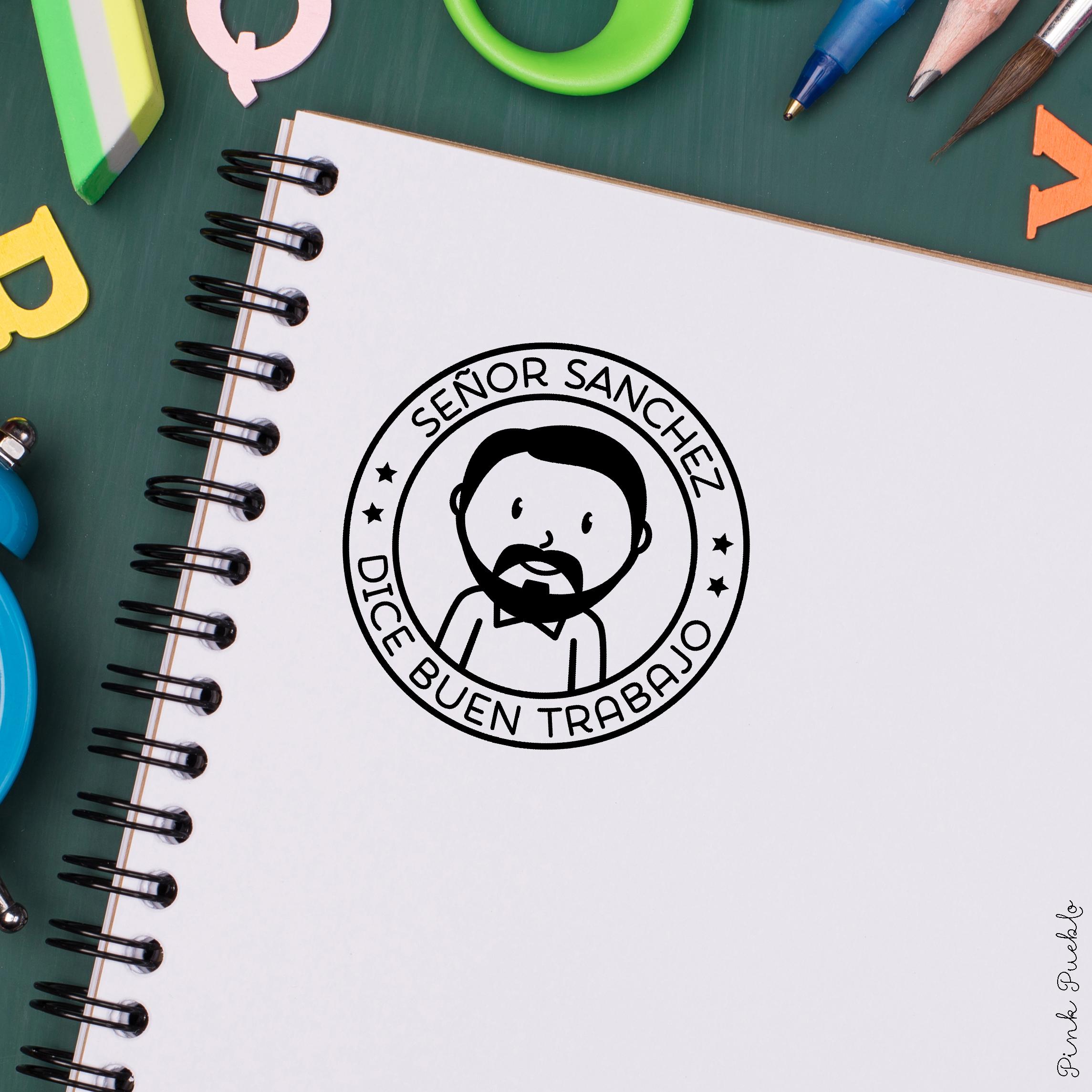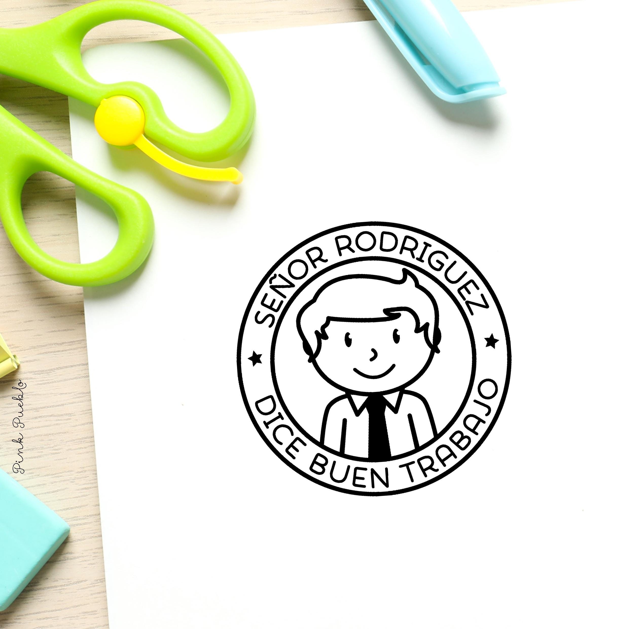 Make grading more fun and personal with this self inking stamp designed just for Spanish classrooms. This custom book stamp is perfect for marking student work, adding personality to school supplies, and encouraging learning in a memorable way. A thoughtful option for teacher gifts, teacher appreciation, or back to school, this custom stamp can be personalized with a name, hairstyle, and accessories to match your favorite teacher. Ideal for gifts for readers, book gifts, or a unique thank you gift, this playful design brings a little extra joy to everyday classroom moments. The stamp art is original art by Devon (that's me!) at the studio of Pink Pueblo. All stamps are hand made and hand packaged in my studio prior to shipment.