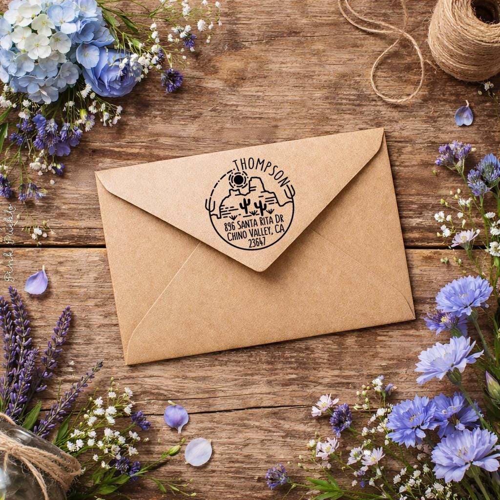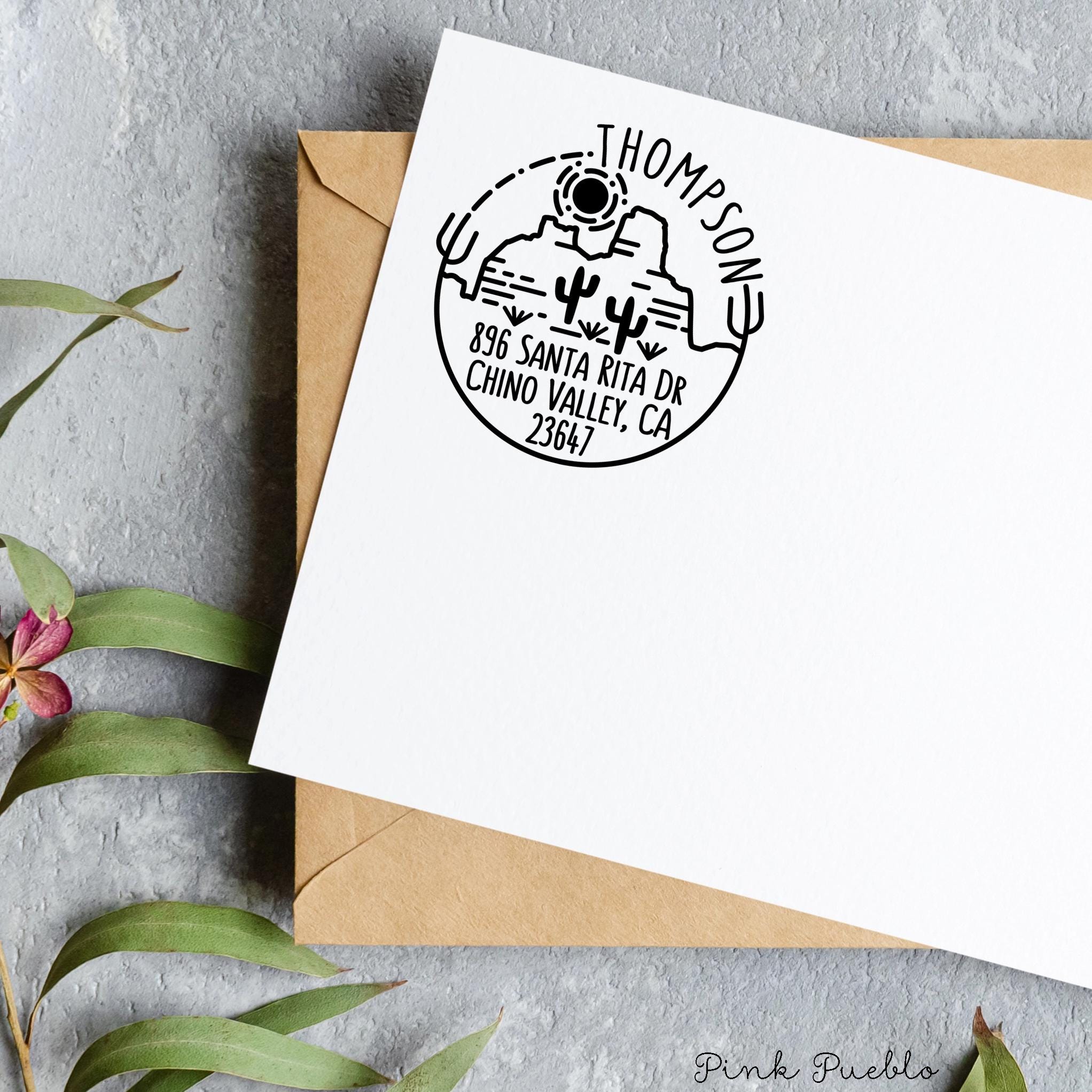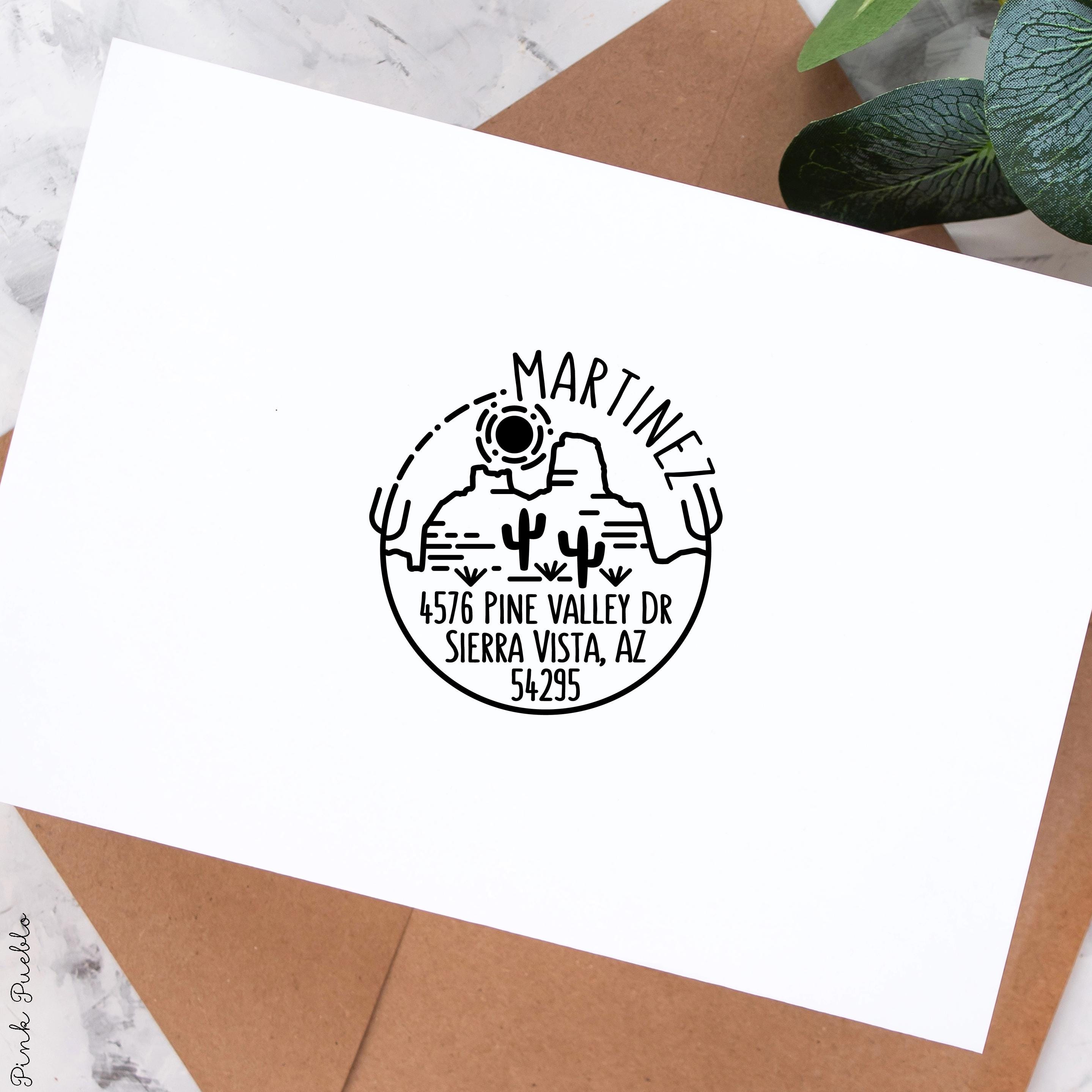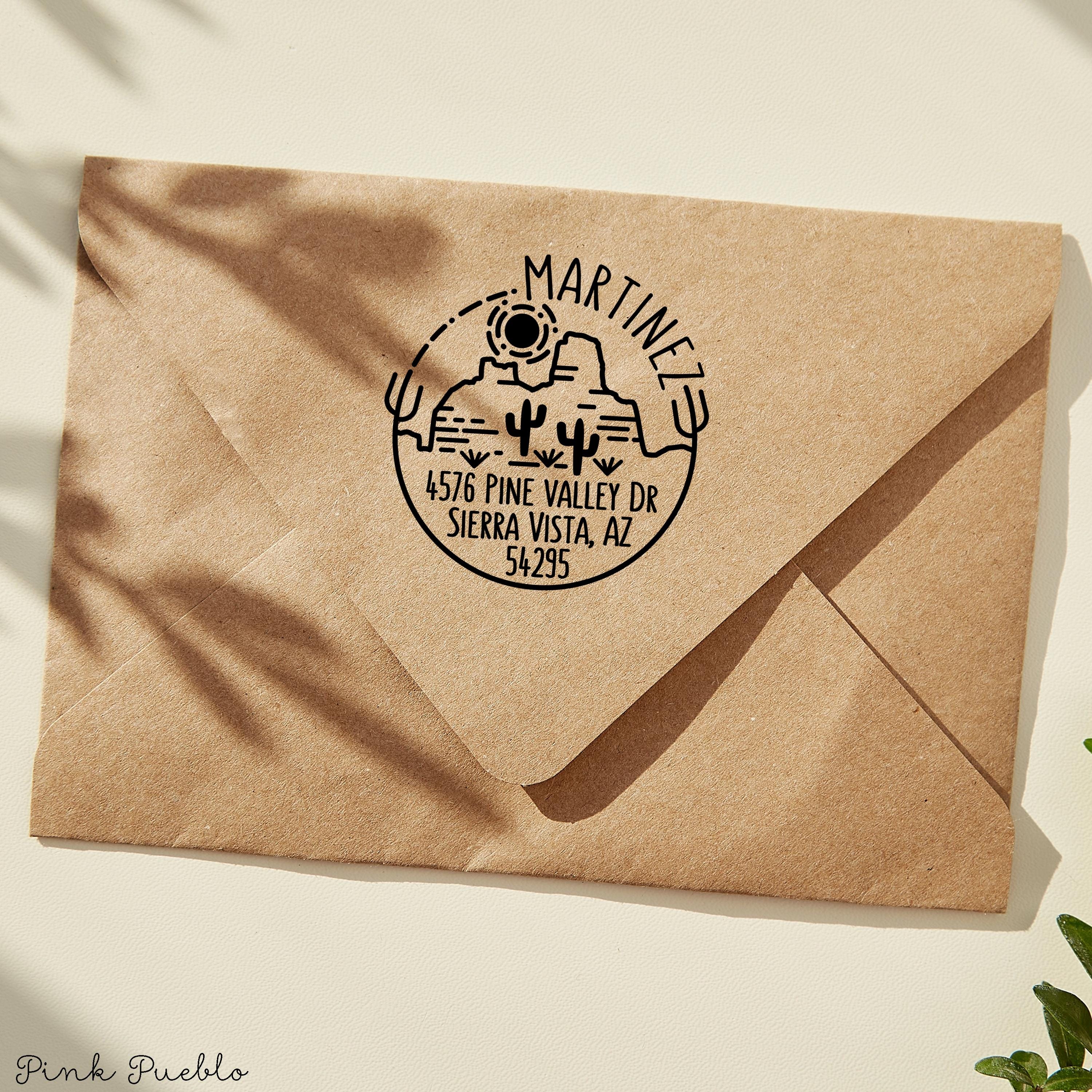 Pink Pueblo's self inking Desert and Cactus address stamp is a great way to add some modern yet rustic flair to envelopes. The stamp art is original art by Devon (that's me!) at the studio of Pink Pueblo. All stamps are hand made and hand packaged in my studio prior to shipment.