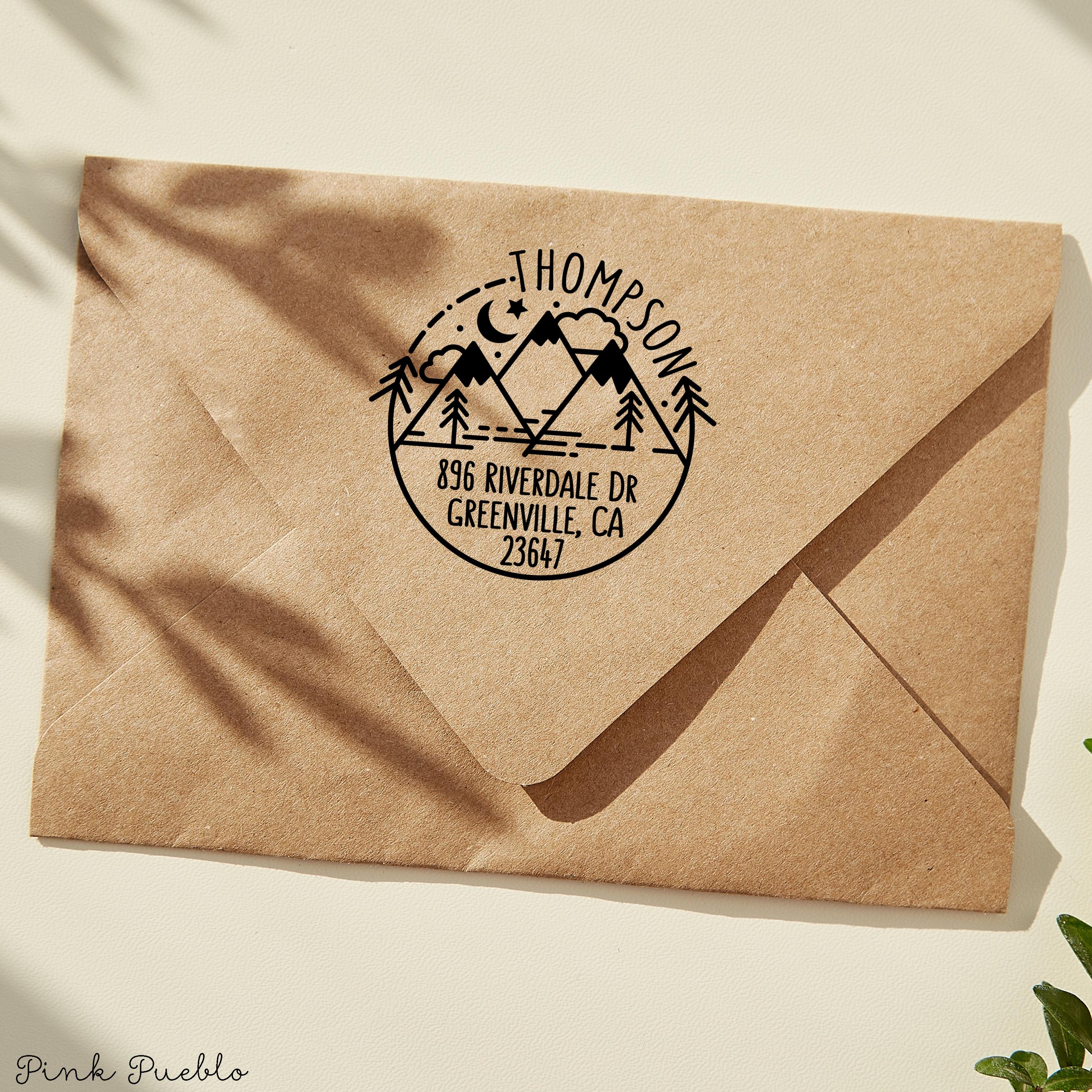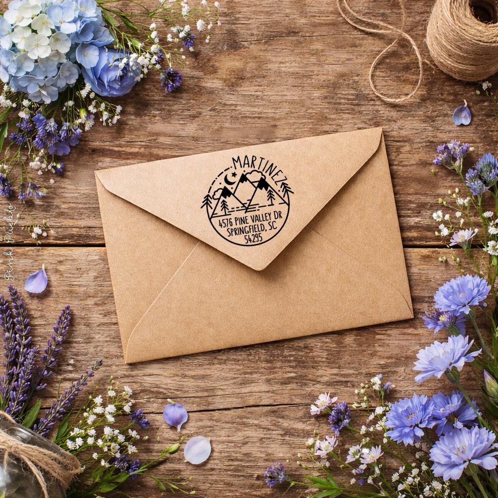 This self inking return address stamp features a modern round design with a scenic mountain motif—perfect for those who love nature, camping, or adventure. A beautiful custom address stamp for personal or business use, it adds a rustic yet stylish flair to your envelopes, address labels, or outgoing mail. Ideal as a housewarming gift, new home gift, or thoughtful travel gift, this rubber stamp makes everyday correspondence feel extra special. The stamp art is original art by Devon (that's me!) at the studio of Pink Pueblo. All stamps are hand made and hand packaged in my studio prior to shipment.