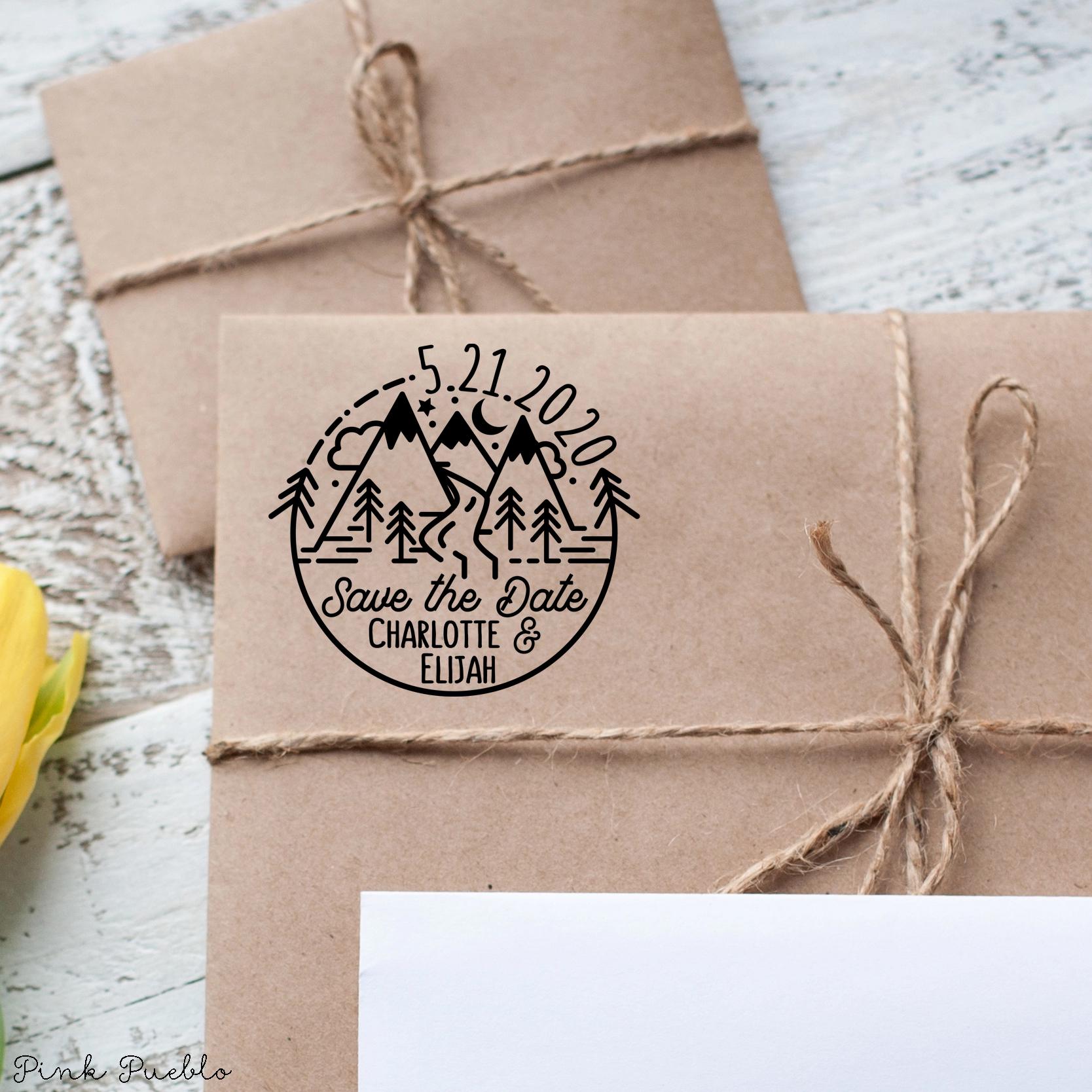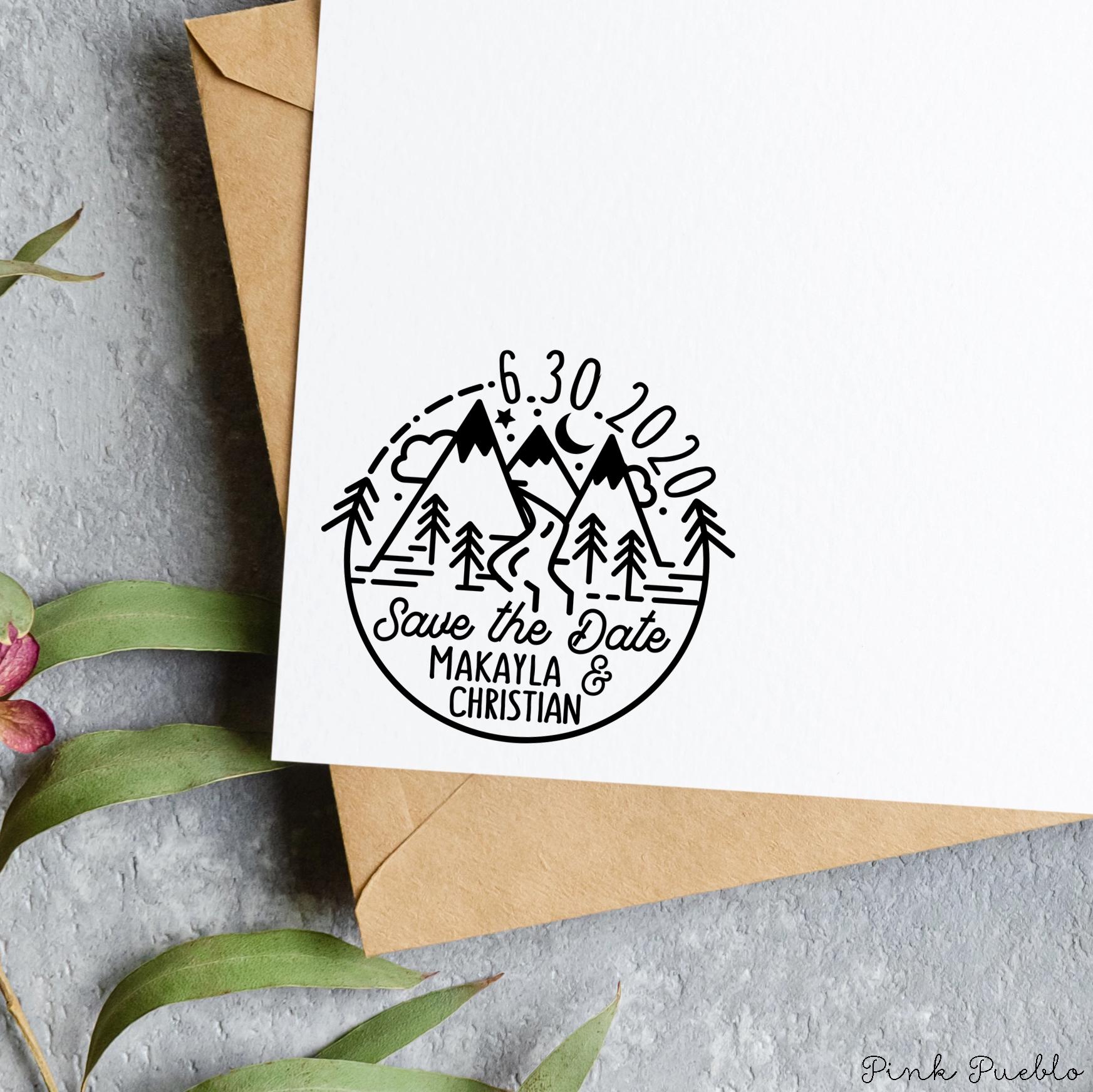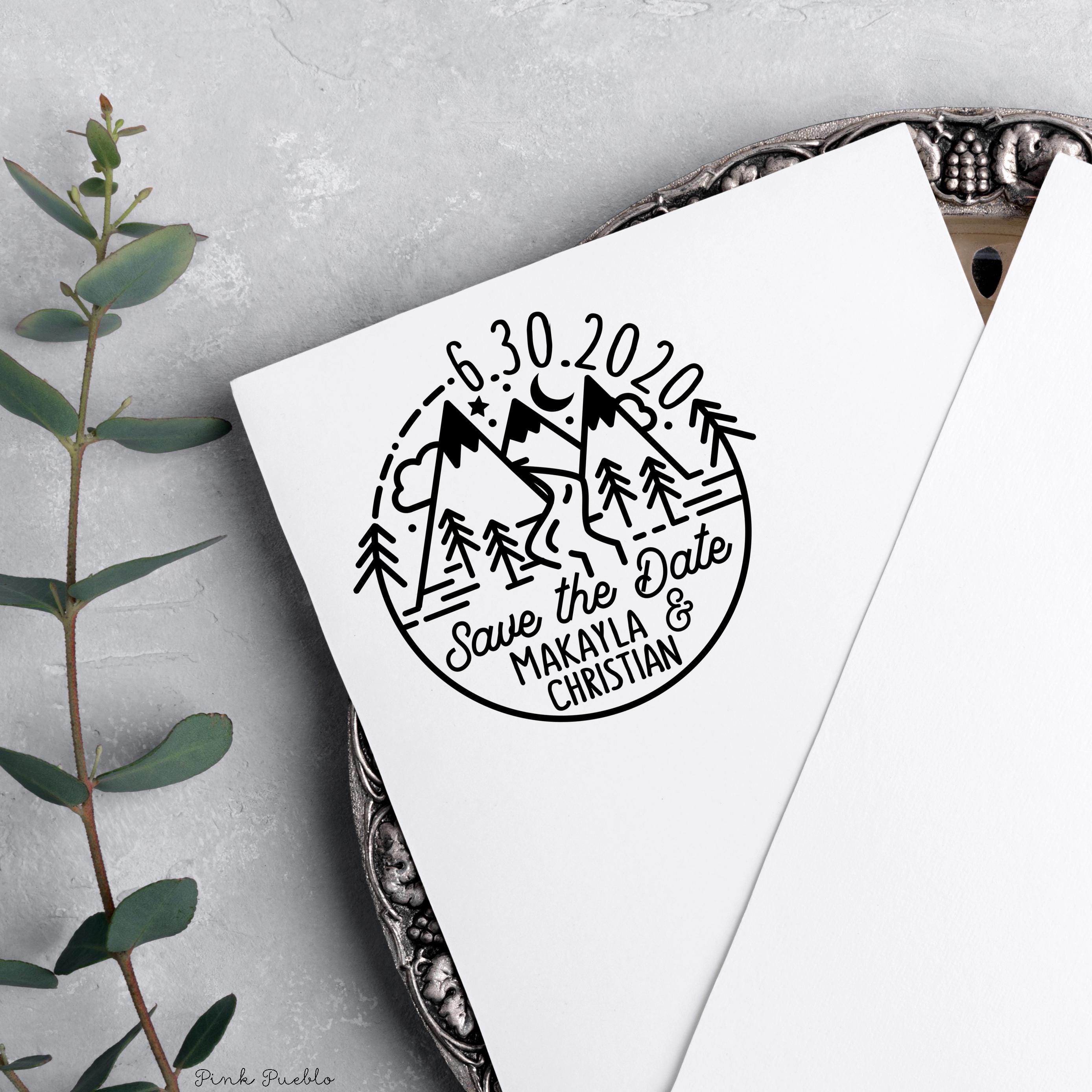 Celebrate your rustic wedding or mountain destination engagement with Pink Pueblo's custom self inking Save the Date stamp. Perfect for wedding invitations, wedding invites, and engagement party stationery, this personalized stamp adds a charming, natural touch to your envelopes and save the dates. Designed for couples who love the outdoors, this wedding stamp also makes a beautiful addition to your wedding monogram and decor. Easy to use and a perfect match for rustic wedding themes! The stamp art is original art by Devon (that's me!) at the studio of Pink Pueblo. All stamps are hand made and hand packaged in my studio prior to shipment.