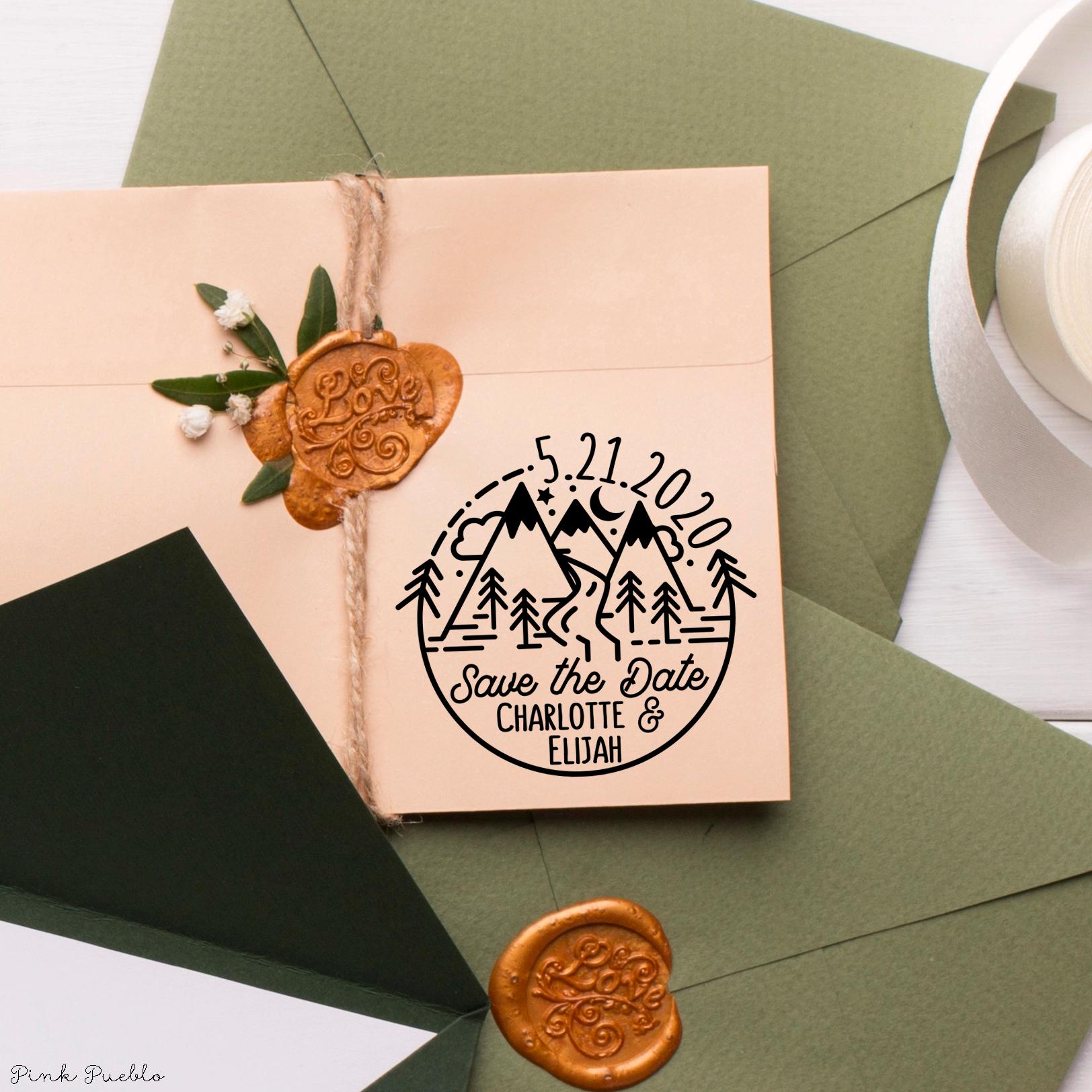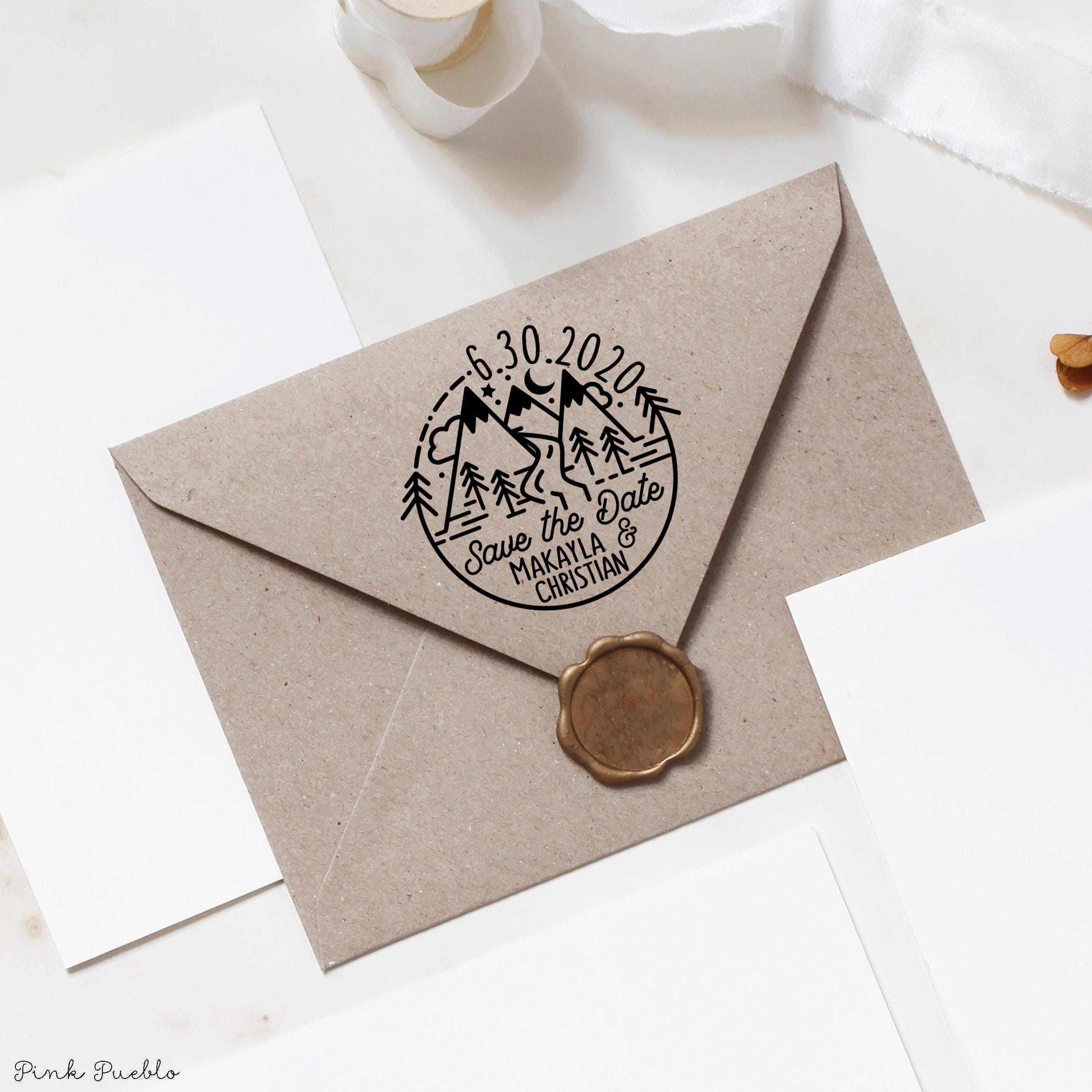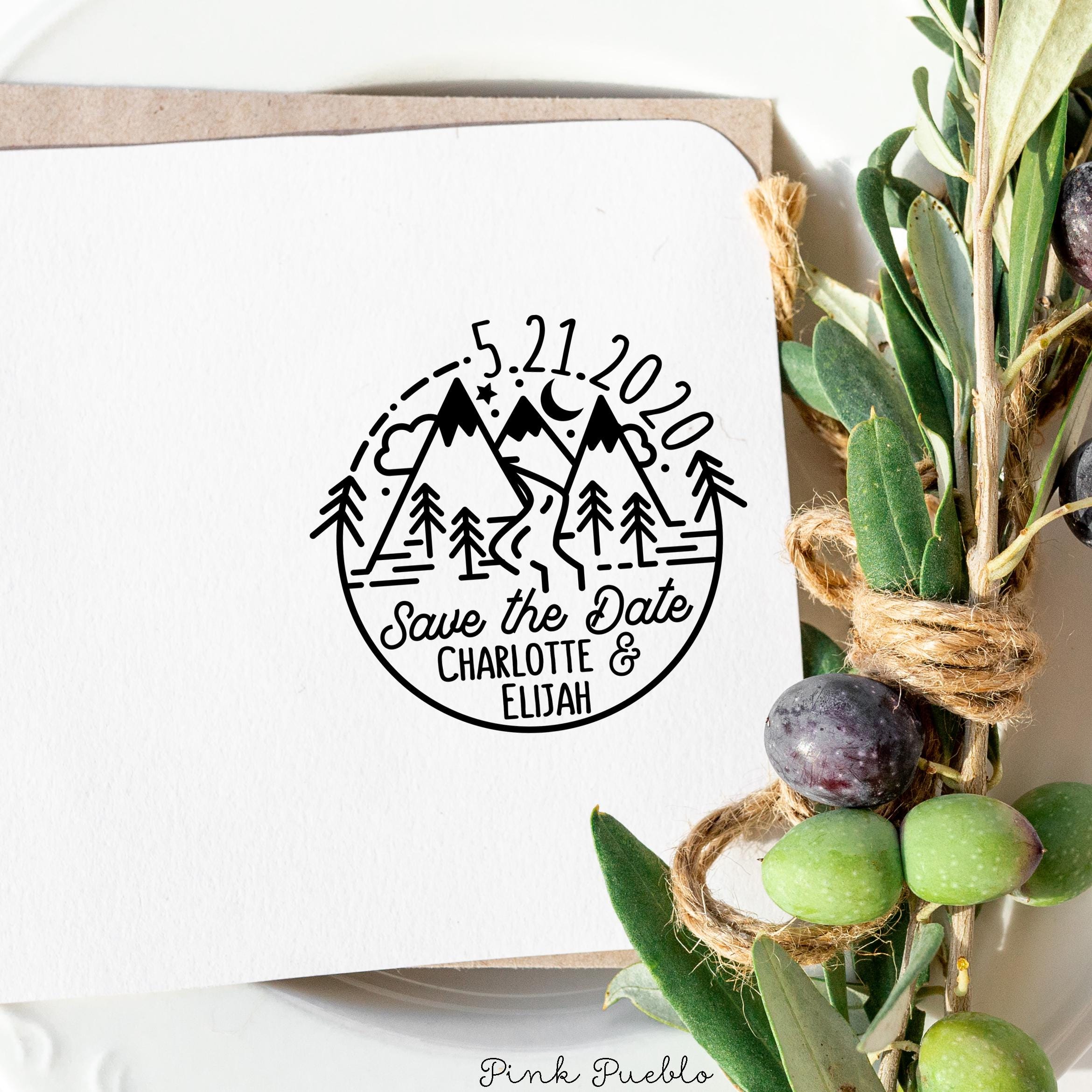 Celebrate your rustic wedding or mountain destination engagement with Pink Pueblo's custom self inking Save the Date stamp. Perfect for wedding invitations, wedding invites, and engagement party stationery, this personalized stamp adds a charming, natural touch to your envelopes and save the dates. Designed for couples who love the outdoors, this wedding stamp also makes a beautiful addition to your wedding monogram and decor. Easy to use and a perfect match for rustic wedding themes! The stamp art is original art by Devon (that's me!) at the studio of Pink Pueblo. All stamps are hand made and hand packaged in my studio prior to shipment.