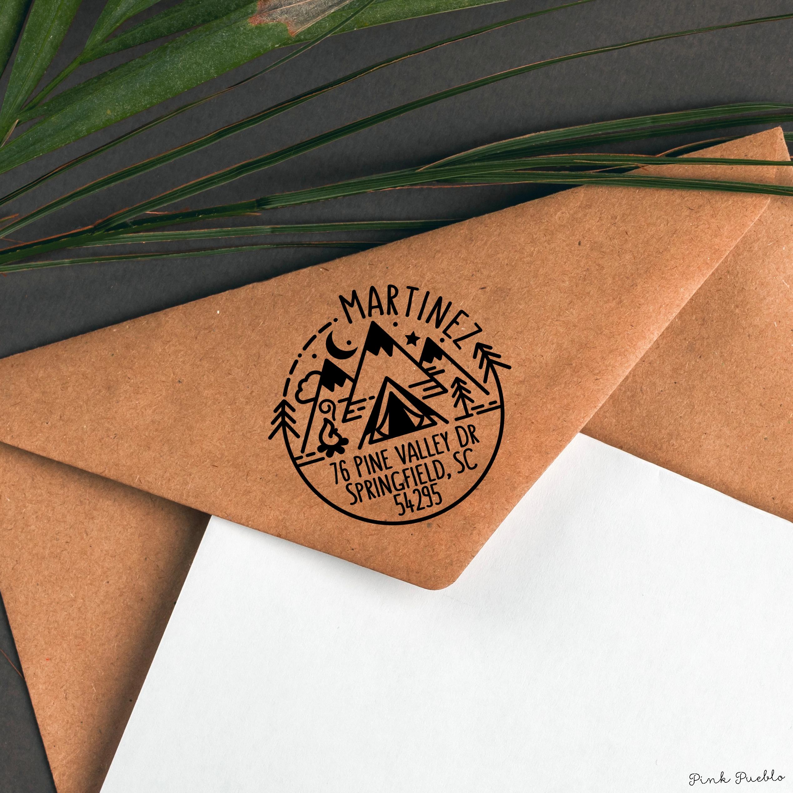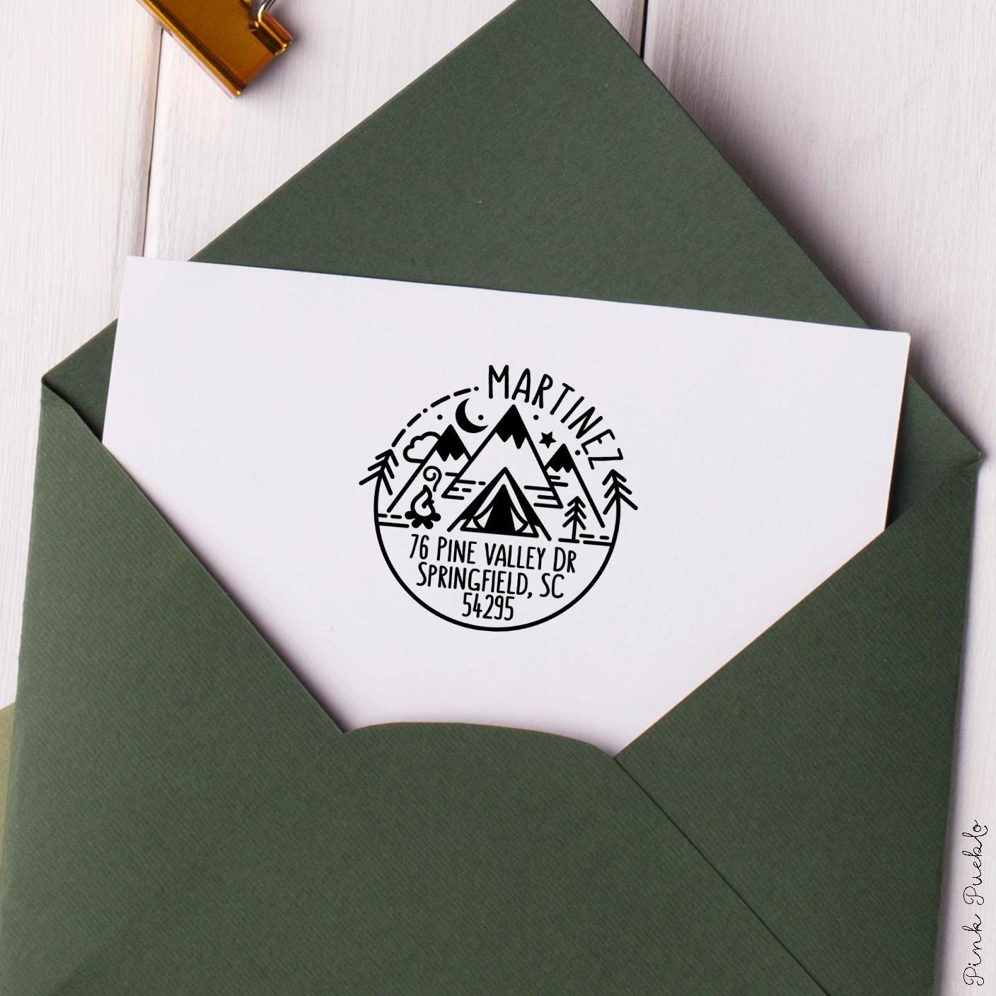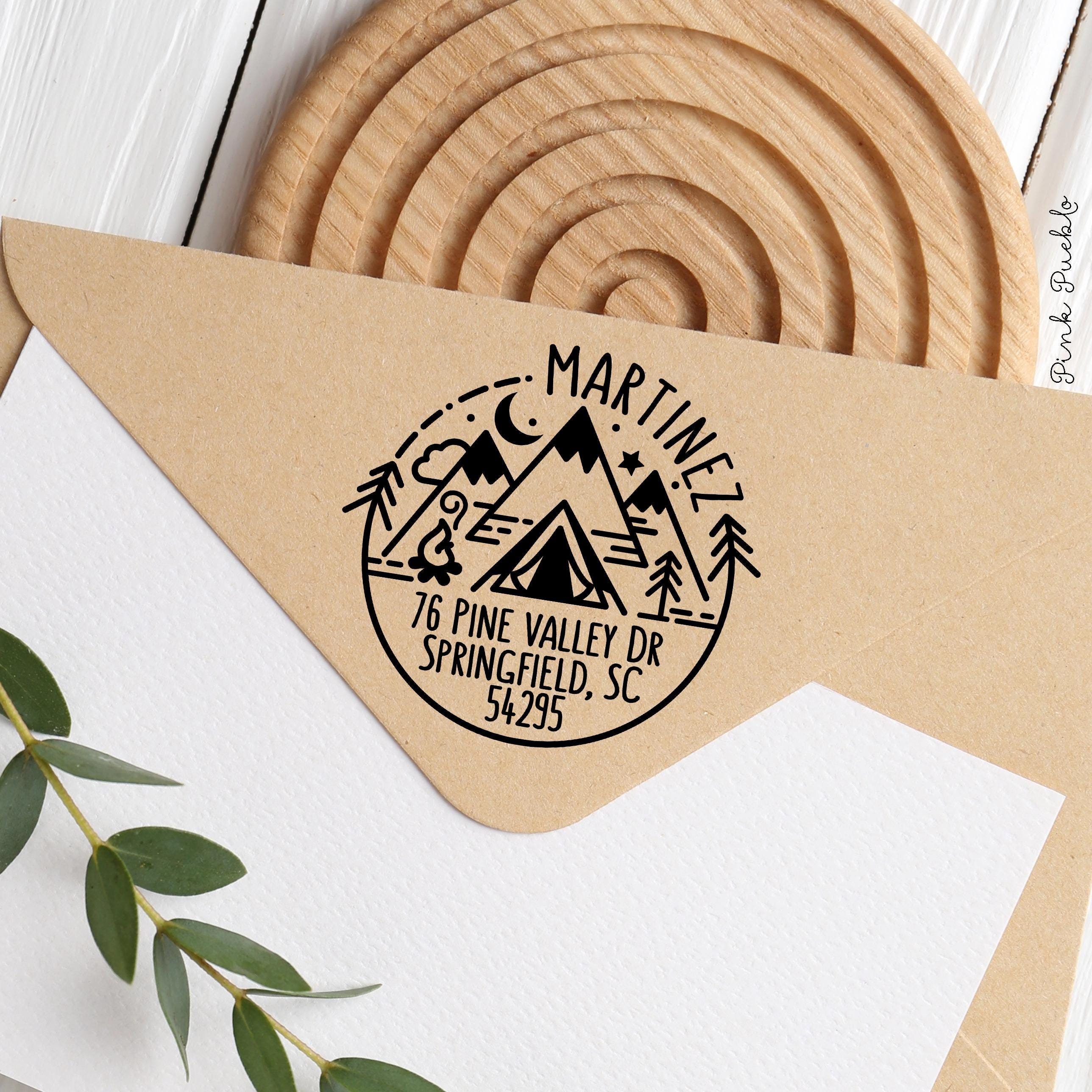 Add an outdoorsy touch to your mail with this self inking stamp featuring a scenic mountain design inspired by the spirit of the national park. This address stamp makes it easy to mark envelopes with your return address while bringing a bit of camping adventure to everyday mail. Perfect for nature lovers and travelers, this custom address stamp creates crisp impressions again and again without needing a separate ink pad. A fun alternative to address labels, this durable custom stamp keeps your mail organized while showing off your love of the outdoors. The stamp art is original art by Devon (that's me!) at the studio of Pink Pueblo. All stamps are hand made and hand packaged in my studio prior to shipment.