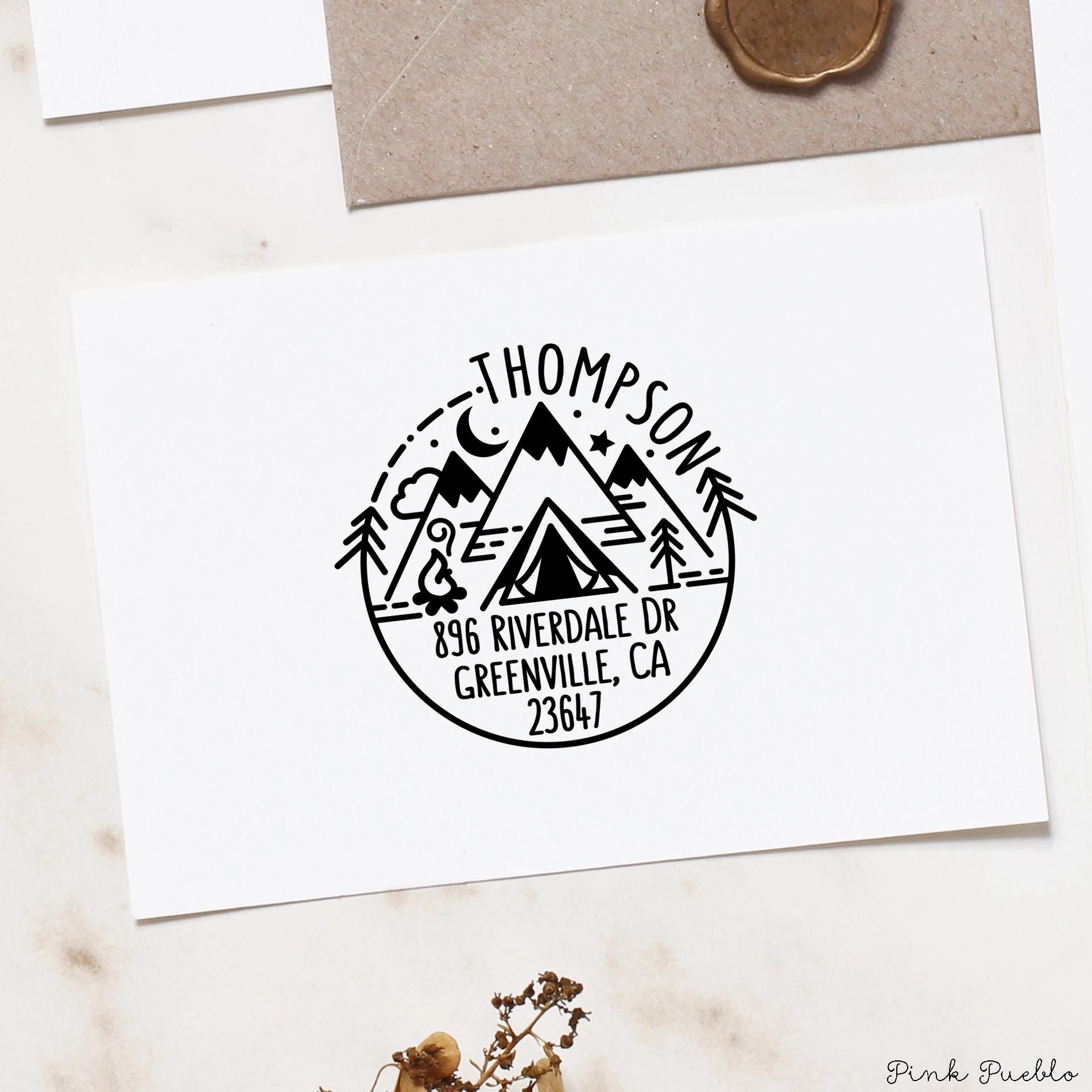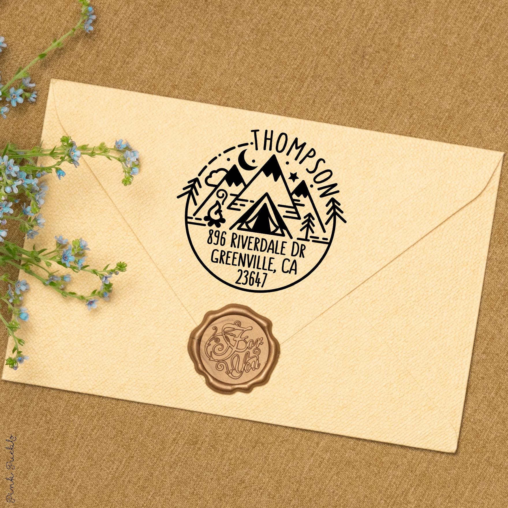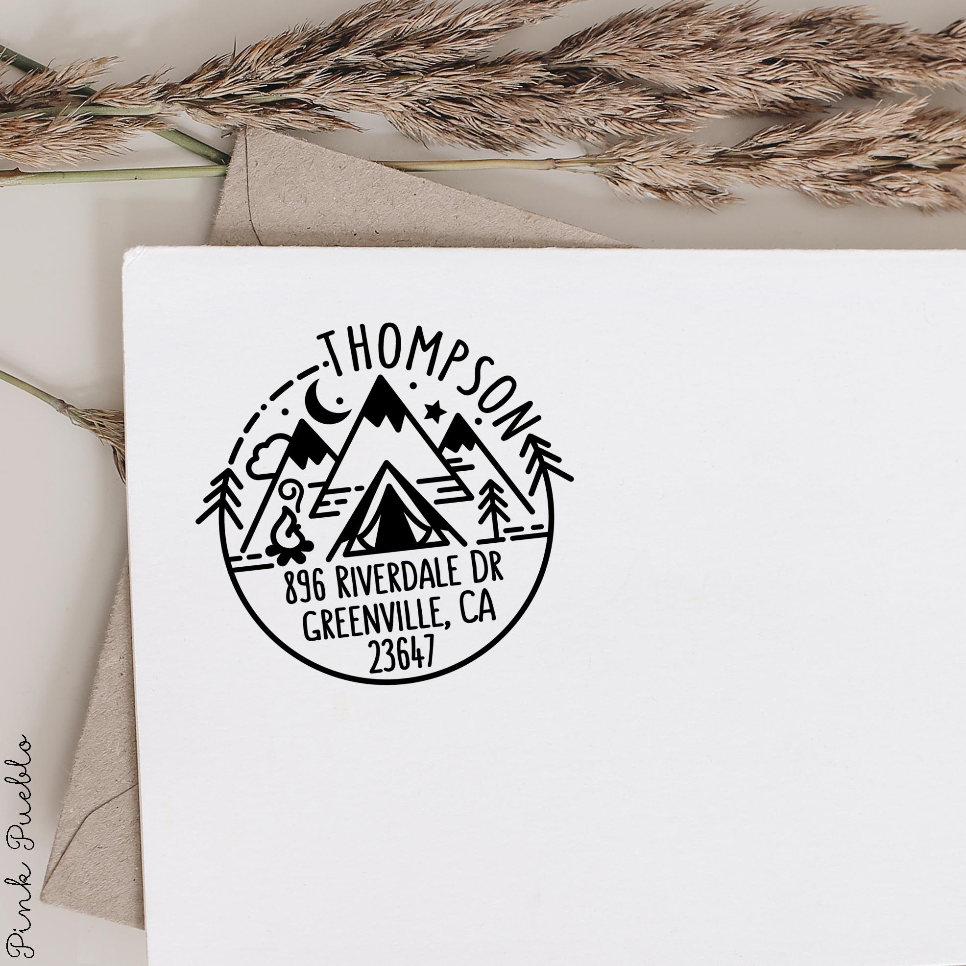 Add an outdoorsy touch to your mail with this self inking stamp featuring a scenic mountain design inspired by the spirit of the national park. This address stamp makes it easy to mark envelopes with your return address while bringing a bit of camping adventure to everyday mail. Perfect for nature lovers and travelers, this custom address stamp creates crisp impressions again and again without needing a separate ink pad. A fun alternative to address labels, this durable custom stamp keeps your mail organized while showing off your love of the outdoors. The stamp art is original art by Devon (that's me!) at the studio of Pink Pueblo. All stamps are hand made and hand packaged in my studio prior to shipment.