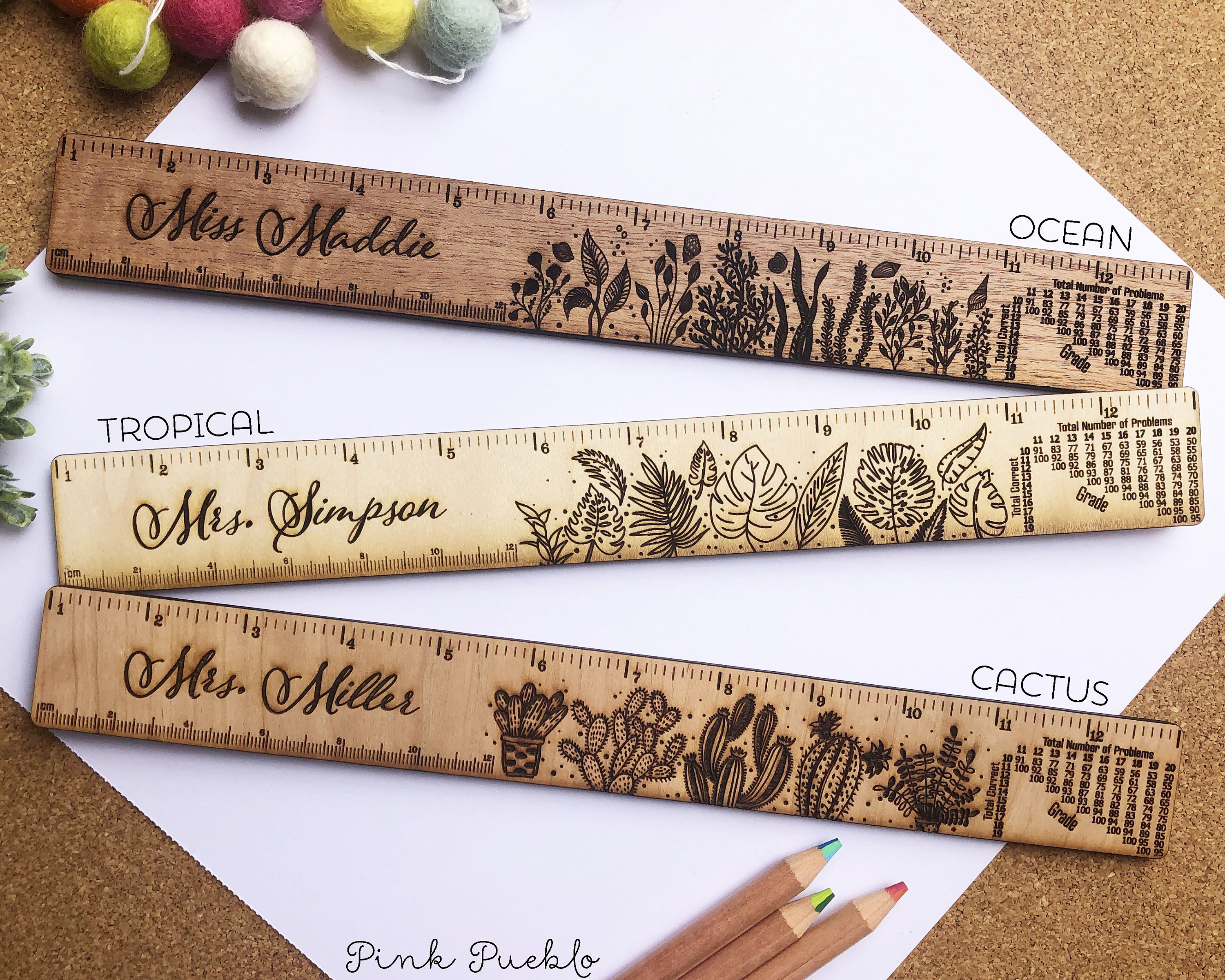 Pink Pueblo's personalized Teacher Ruler is a beautiful teacher appreciation or holiday present for your favorite teacher! Each ruler is engraved with your teacher's name, your design of choice and a handy grading scale. All rulers are engraved and hand packaged in my studio prior to shipment.